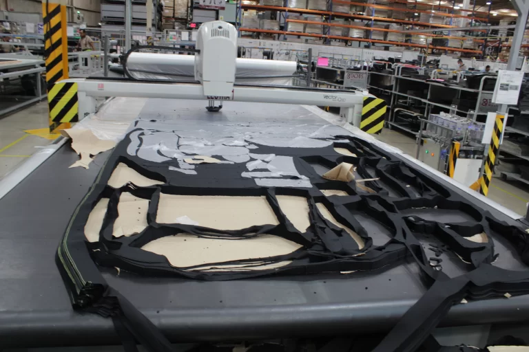 Durante el proceso CUT en Tachi-S se realizan cortes exactos de los materiales que conforman las fundas y revestimientos del asiento, asegurando precisión, calidad y uniformidad en cada pieza producida.