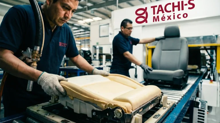 Durante el proceso FOAM en Tachi-S se aplica espuma de poliuretano mediante sistemas de inyección y expansión controlada. Este proceso permite obtener componentes con la forma, densidad y firmeza requeridas para garantizar comodidad, durabilidad y un desempeño óptimo del asiento durante toda su vida útil.